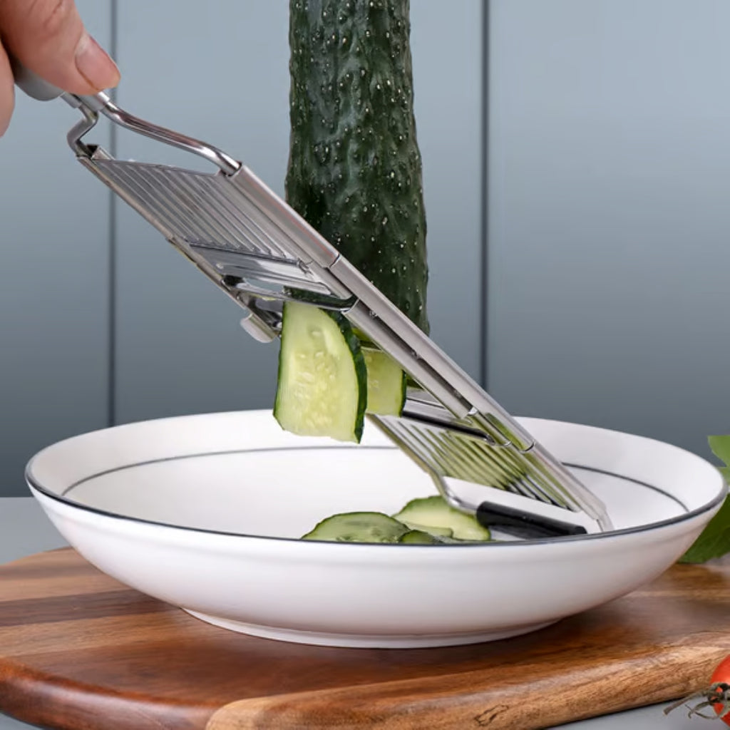 The Multi-Purpose Vegetable Slicer comes with interchangeable blades that let you cut 8 slices in just one swiping action! Shred various fruits and vegetables smoothly!